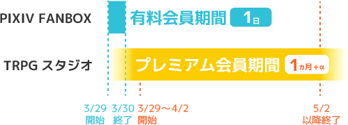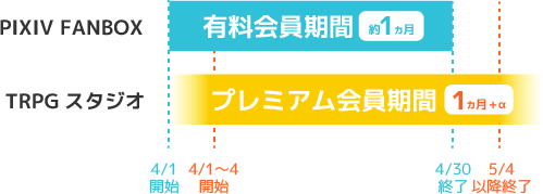 TRPGスタジオプレミアム会員期間はいつお申込みいただいても変わりませんが、PIXIV FANBOXの有料会員期間はお申込み時期により異なります。