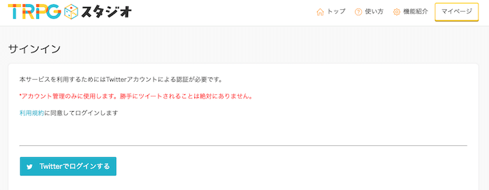 TRPGスタジオのユーザー登録にはTwitterアカウントが必要になりますので事前にご用意ください。