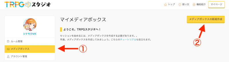 左メニューから「①メディアボックス」を選択、「②メディアボックスの新規作成」をクリックして下さい。
