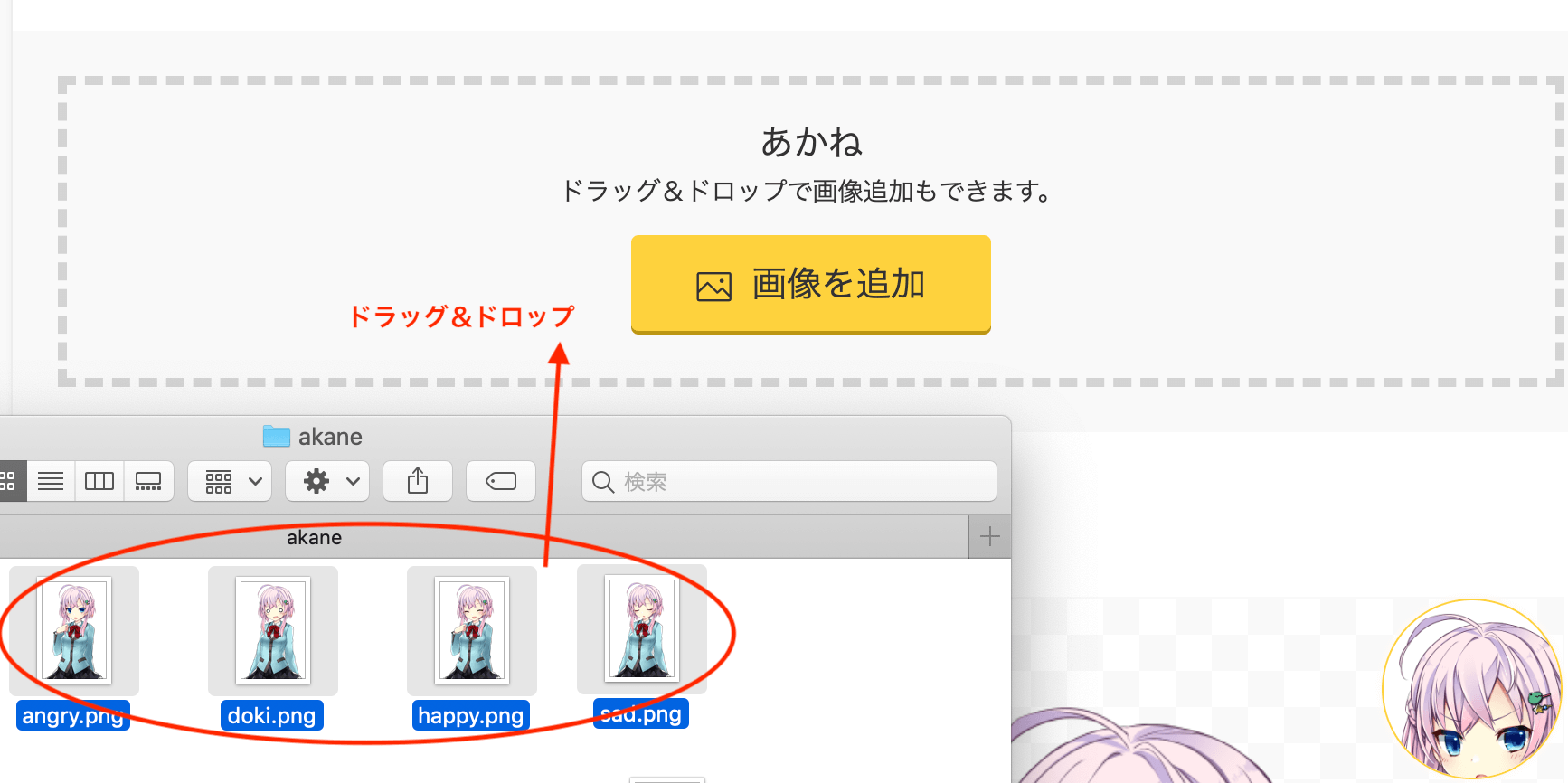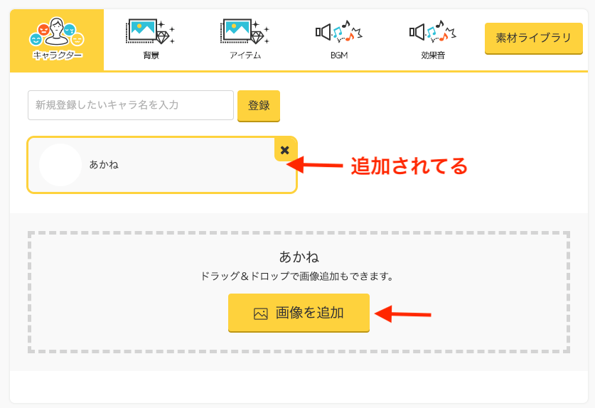 キャラクターが追加されるので、先程用意したキャラクターが画像をアップロードします。