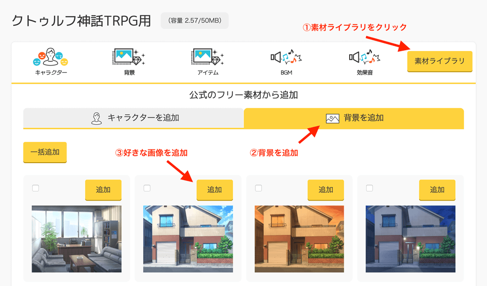 TRPGスタジオでは、自分で用意しなくても、フリー素材を簡単に取り込めるようになっています。