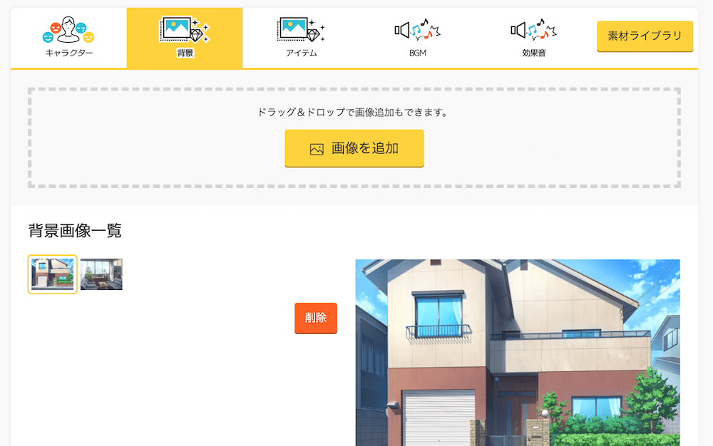 アップロードする素材もこのサイズを基準にして、例えばキャラクターの立ち絵なら 300x700 といったサイズだと自然にプレイできるかと思います。