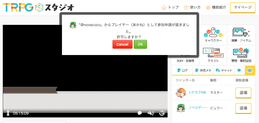GMはプレイヤーから参加申請を受けると次のような確認ダイアログが表示されます。