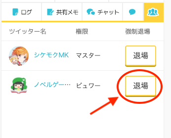 間違えて申請OKしてしまった場合は、GMがメンバータブから「退場」を押して解除します。