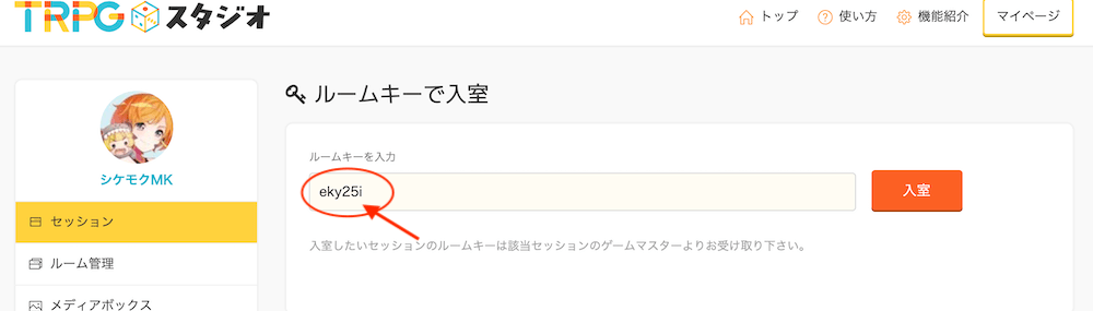 プレイヤーは左メニューの「セッション」からルームキー検索画面に移動します。
