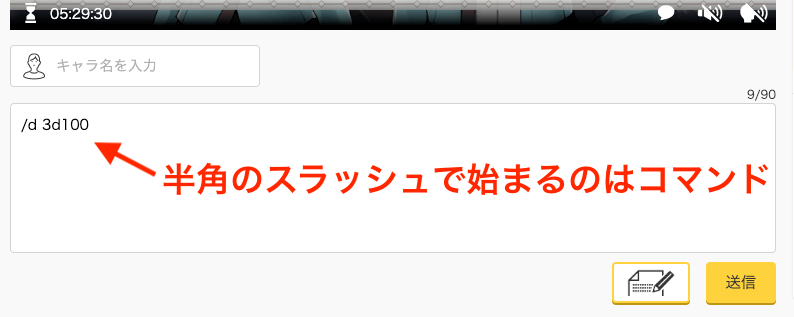 ダイスにはショートカットコマンドが用意されています。発言エリアに次のように打ち込むと、ダイスを振ることができます。