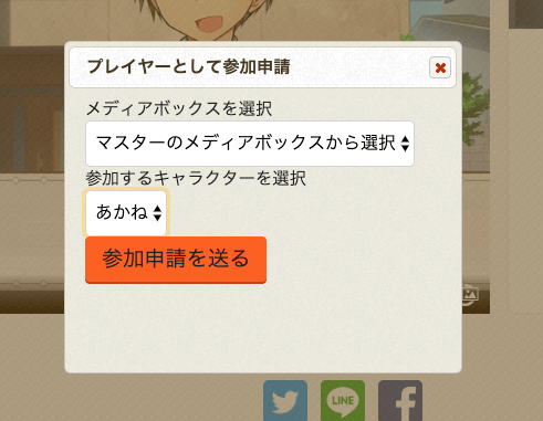 もし、キャラクターを自前で作ってから参加する場合は、自分が所持するメディアボックスからキャラクターを選択して申請します。