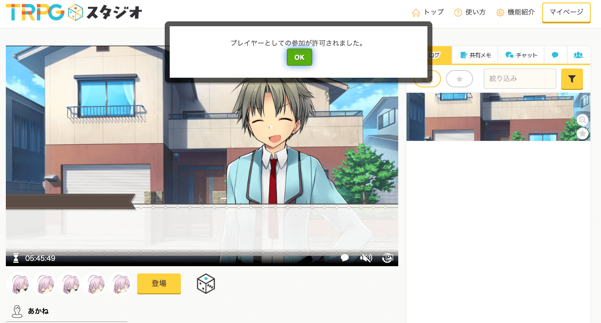 承認がおりると、プレイヤーとしてセッションに参加できるようになりました。