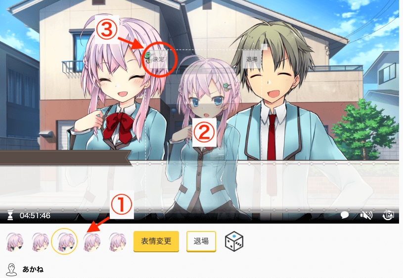キャラクターの移動は①顔アイコンをクリックして選択状態にして、ドラッグ&ドロップで移動します。