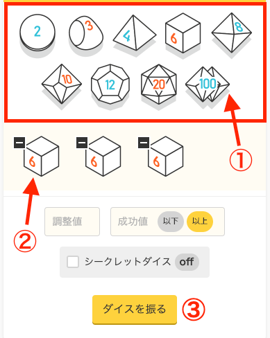 例えば6面ダイスを3個(3d6)振りたい場合、①のエリアから6面ダイスアイコンを3回クリックします。