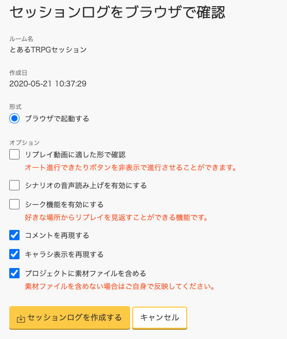 ここから、ブラウザゲーム化したいセッションを選んで「ブラウザ再生」をクリックして下さい。