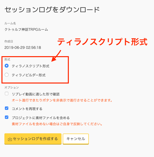 続いて確認画面で「ティラノスクリプト形式」が選択されているのを確認します。