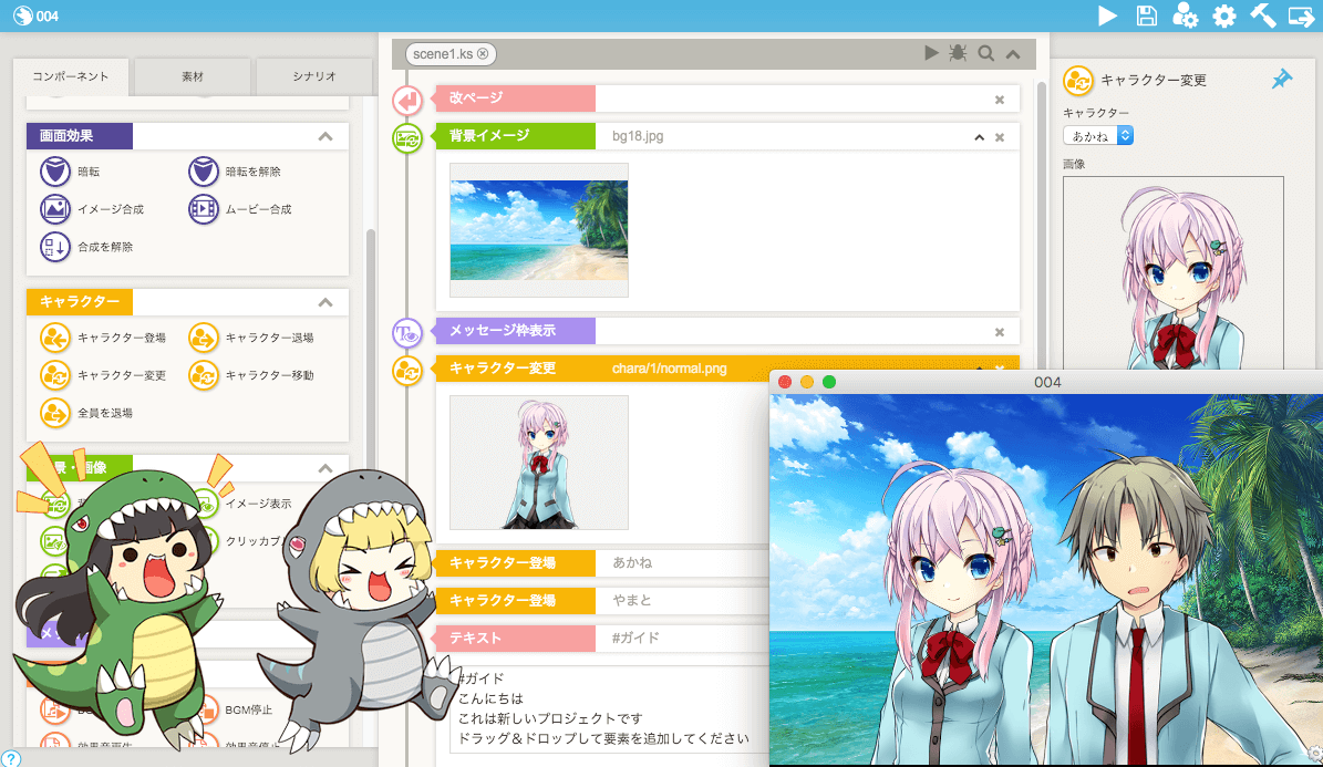 ティラノビルダーはドラッグ&ドロップの簡単な操作だけでADV・ノベルゲームが作れるツールです。