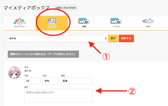 (キャラクターが存在しない場合は、先にキャラクターの作成を行ってください。)