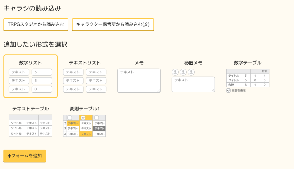 このように、フォームを追加して、TRPGセッションにあわせて最適なキャラシを用意しましょう。