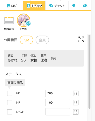 公開範囲を「全員」にするとGM/PL/閲覧者の全員がキャラシの状態を見ることができるようになります。
