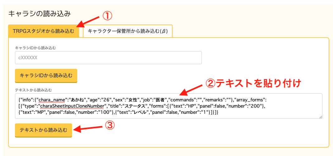 次に新しくキャラシをつくりたいキャラを選択した状態で「①TRPGスタジオから読み込む」をクリック→②先程入手したテキストをすべてコピーして貼り付ける。