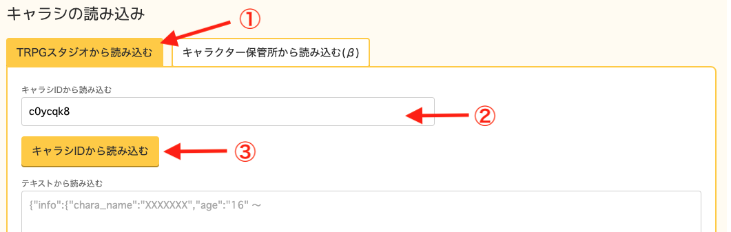 先ほどと同様に、TRPGスタジオから読み込むを押してキャラシIDを入力後「キャラシIDから読み込む」をクリックします。
