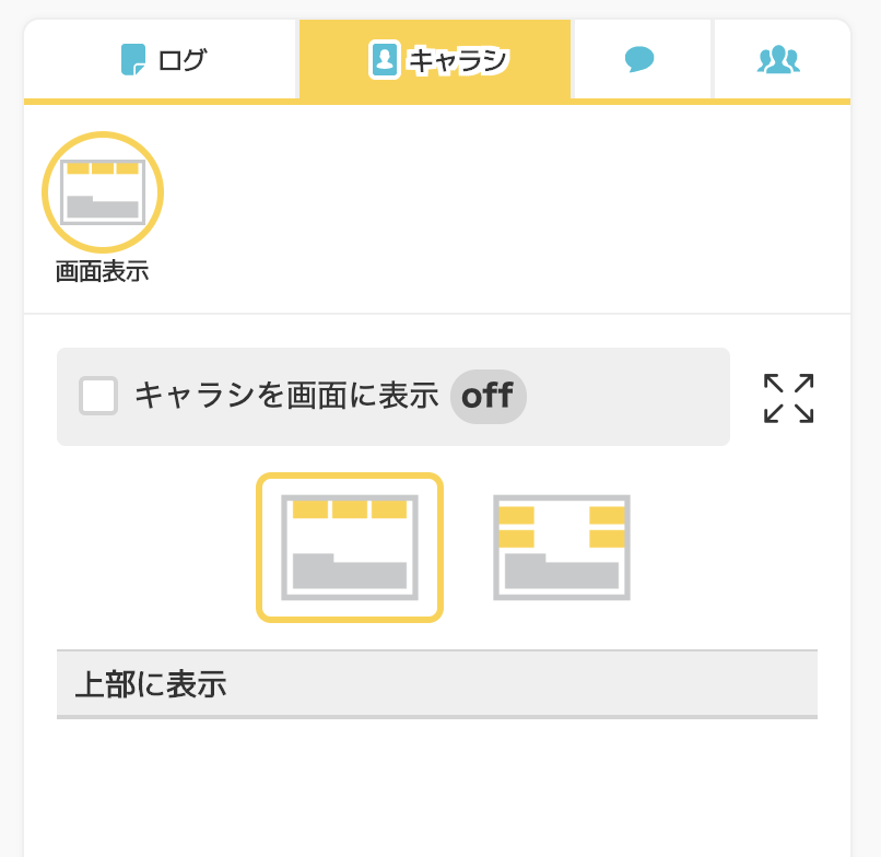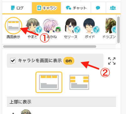 まず、キャラシタブの「画面表示」を選択して「キャラシを画面に表示」にチェックを入れてください。