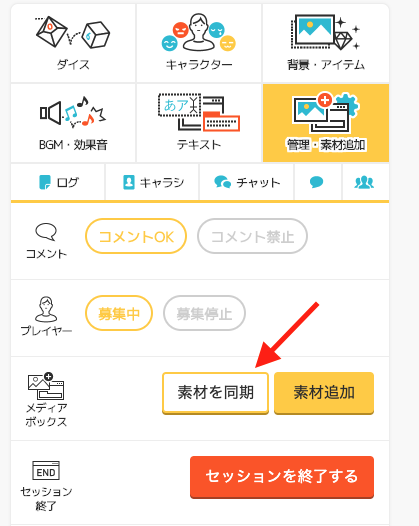 GMが「素材を同期」ボタンを押してください。このタイミングで全員のキャラシが最新のものに更新されます。